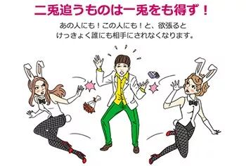 二兎を追う者は一兎をも得ず 一心不能二用 这句谚语作为「一石二鸟」的反义词而闻名,排行第三。这是罗马人文主义学者的名言「同时瞄准一个以上的目标后只会什么都得不到」,教导人们世间的严峻。